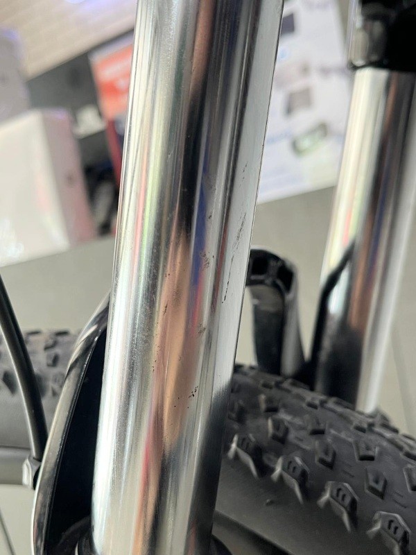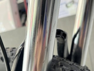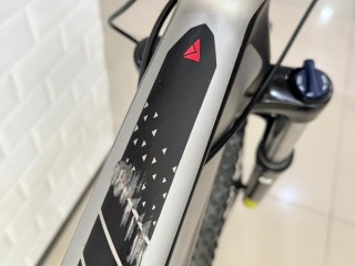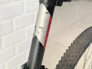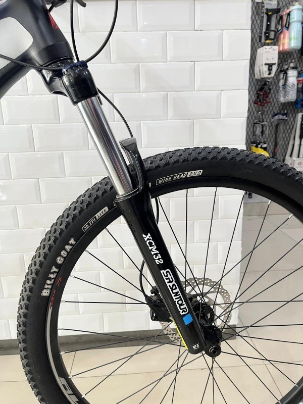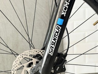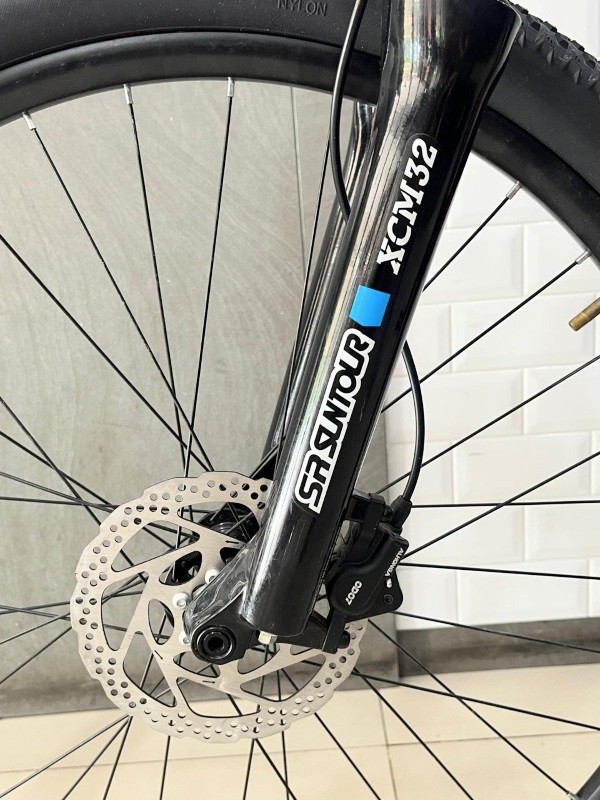 Menggunakan fork Suntour XCM 32 HLO T120mm Thru Axle , dengan travel 120mm membuat posisi stang lebih tinggi sehingga postur pemakai dapat lebih tegak, selain tentunya menambah kesan gagah.